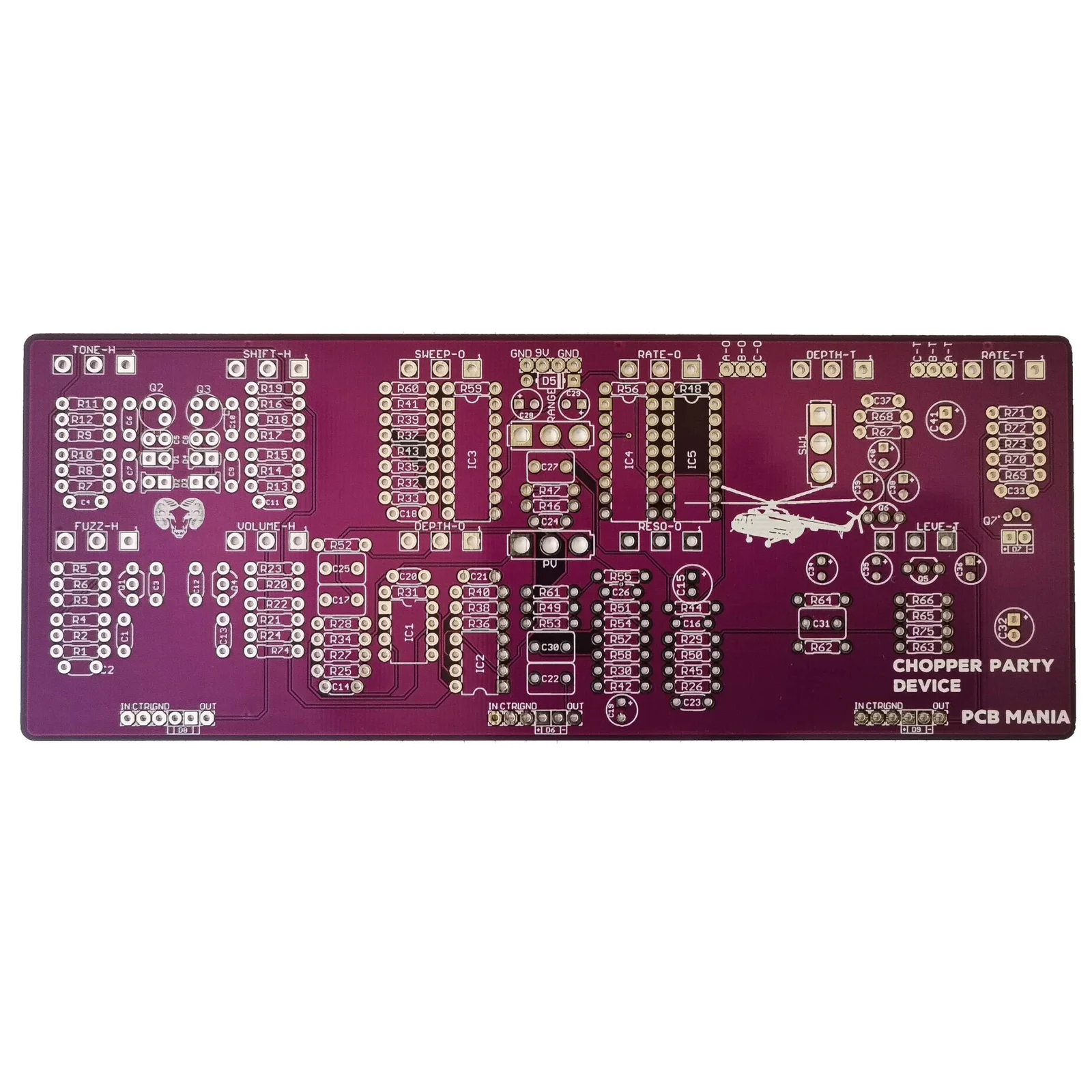 This board is based on the custom-made EarthQuaker Devices Helicopter Party, a one-of-a-kind EQD creation named after the band Party of Helicopters.