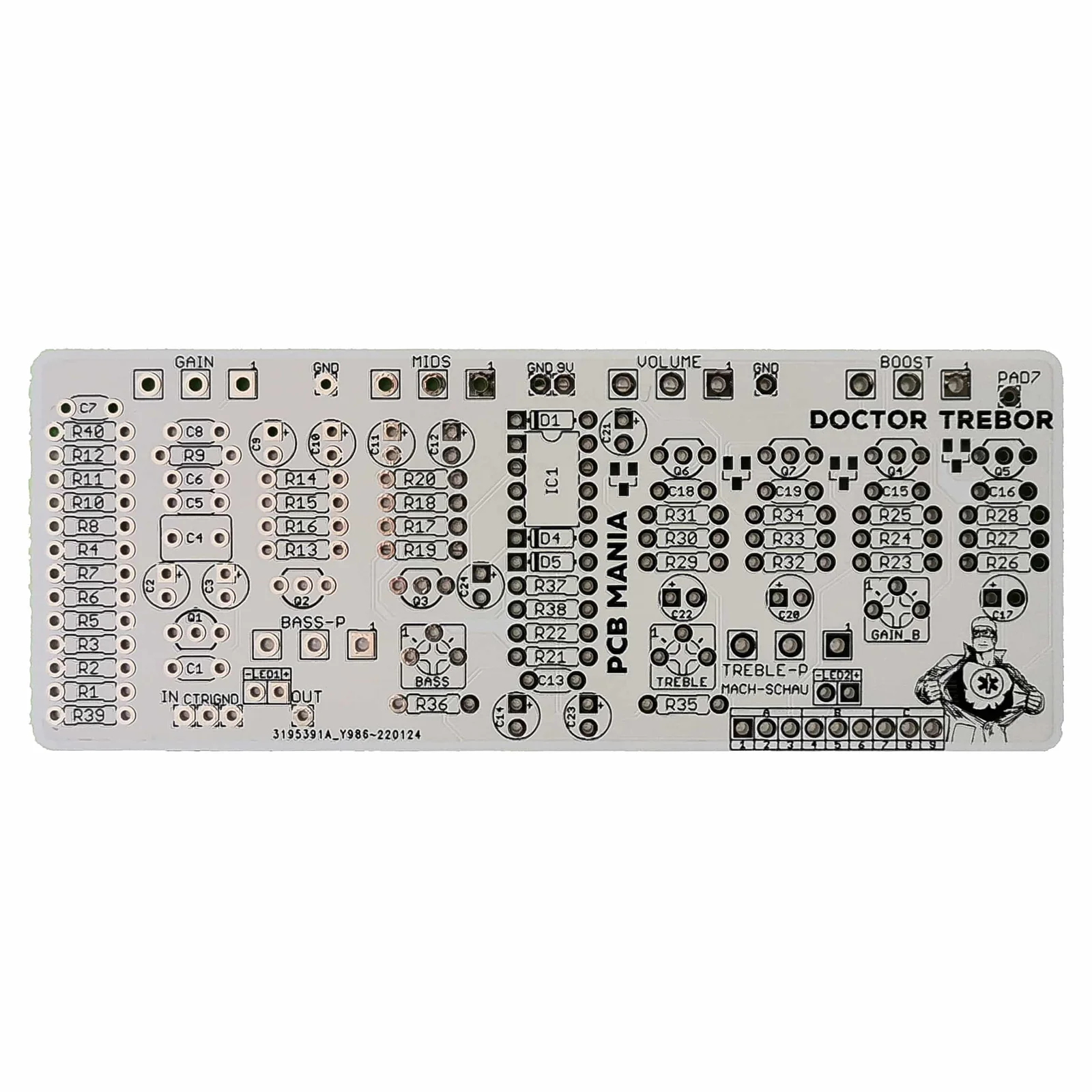 The board is as unique as the amp it’s inspired. On the UL730, Vox separated the midrange control from the rest of the EQ stack, situating it before the volume pot and upstream from the bass and treble controls. Dr. Trebor’s guts are wired similarly, which means that the midrange shapes the pedal’s tone and gain profile profoundly before interacting with an amplifier’s bass/treble tone stack.