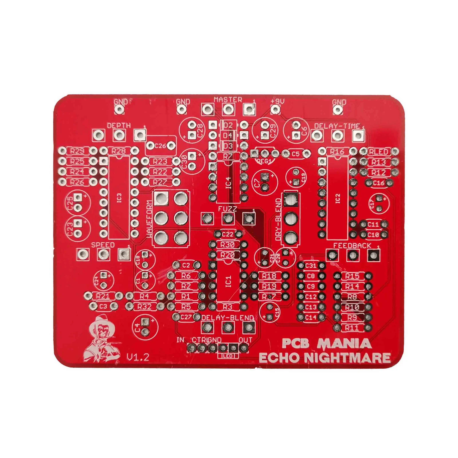 For this case, we have this fuzz-reverb-delay-noise machine featuring a pt2399, one dual opamp (MC3372 on the original, could be replaced by more common ones), one discontinued and hard to find XR2206, plus an internal voltage duble in charge of feeding this circuit with the right voltage!