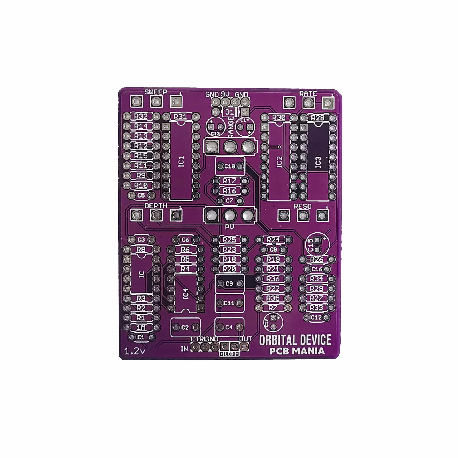 With the Three-way toggle switch, you can select between different ranges of modulation. Try a slow, clean sound with the Rate 1 mode. Kill the LFO and use the Orbital Device as a fixed resonant filter with the Rate 2 mode. Finally, change to a fast sweep mode with Rate 3. Altogether, control the fine-tune speed of the LFO in each of these modes with the master Rate control. The flashing LED acts as a visual indicator, even when the effect is in bypass mode.