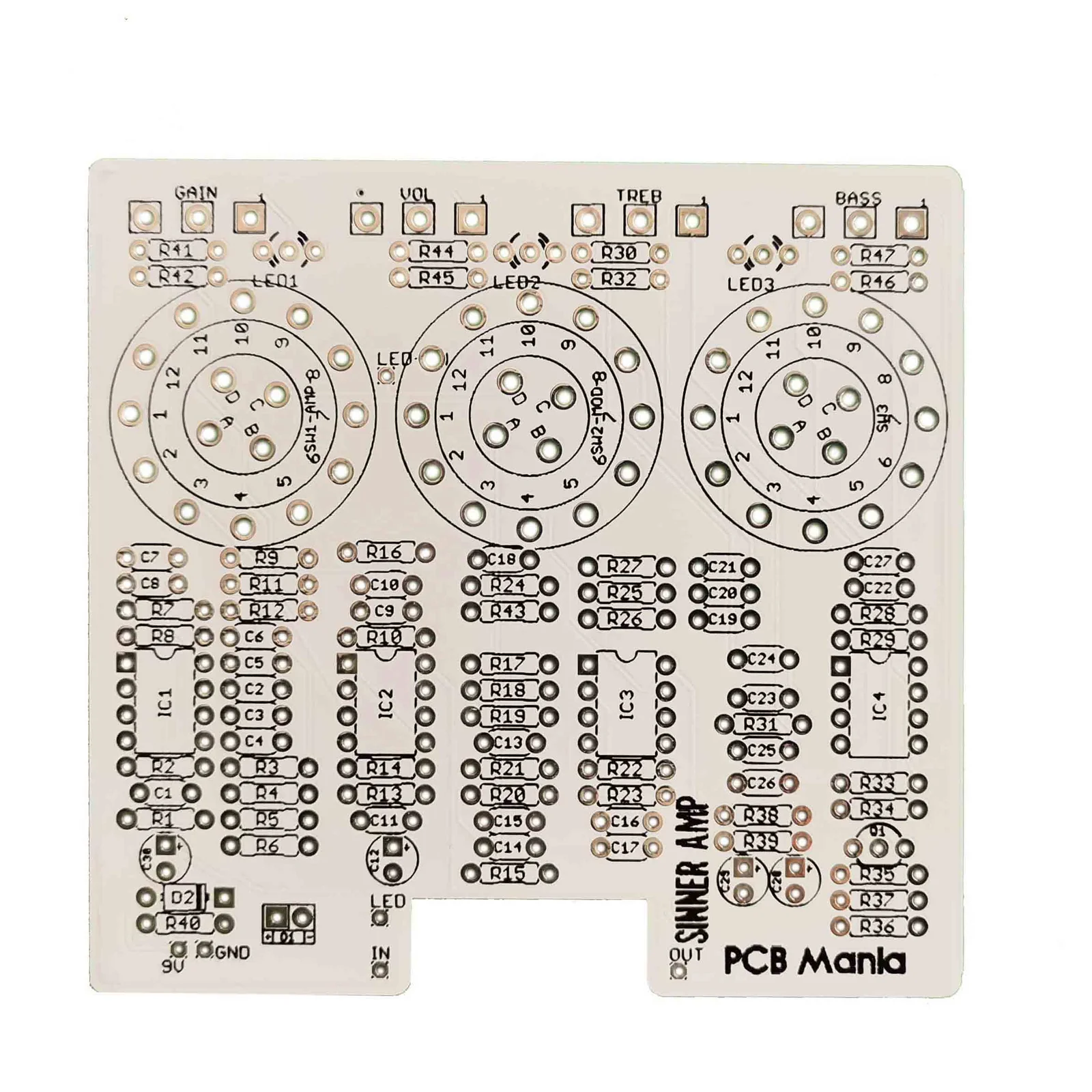 The circuit also has a 2-knobs baxandall tone control to adjust the treble and base frequencies.