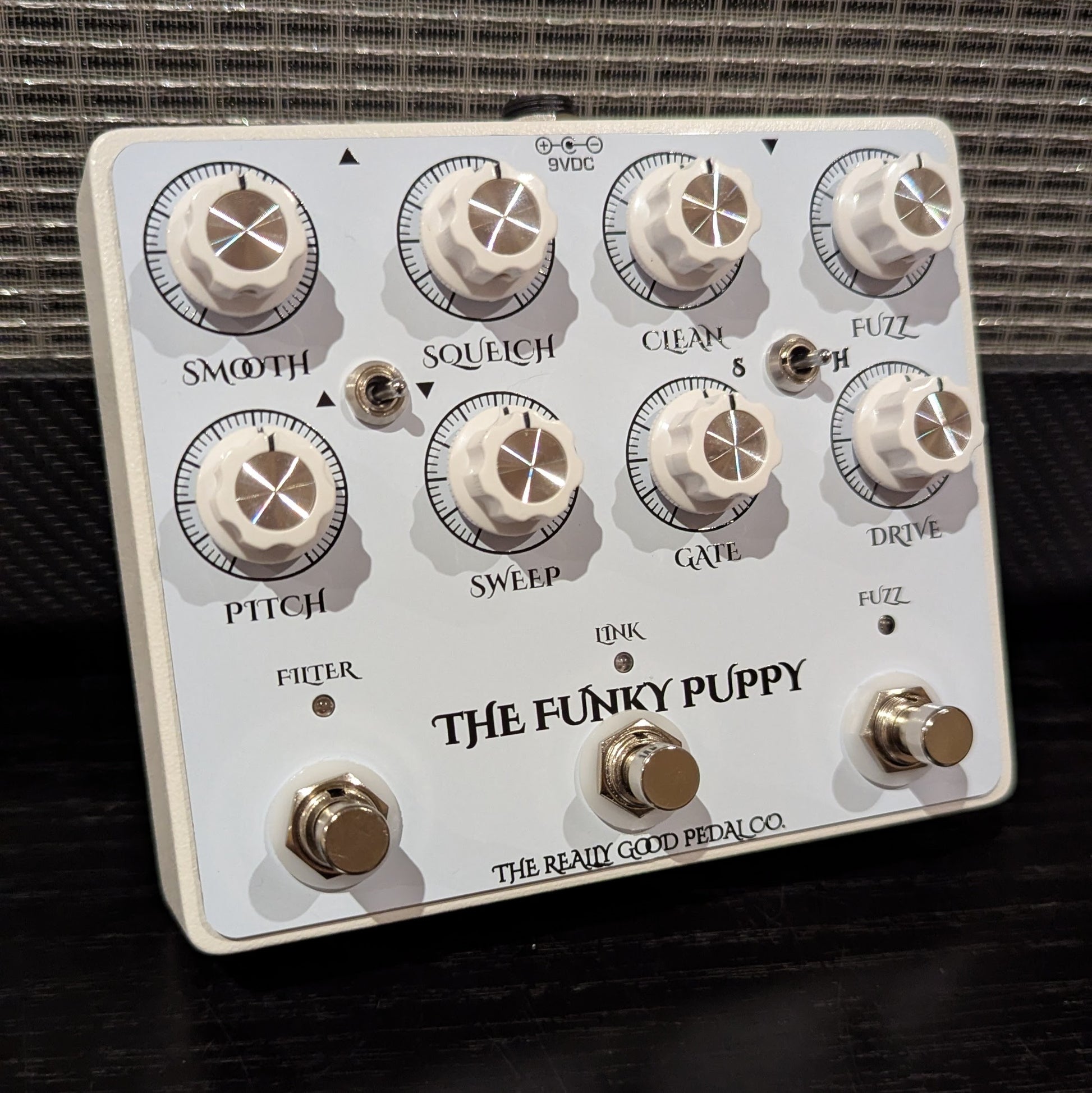 The Funky Puppy is a 2 in 1 version of The Silver Paw and The Silver Funk which allows the user to toggle the link feature with a footswitch rather than using the extra 3.5mm jumper cable needed to use it with the separate stomp boxes.