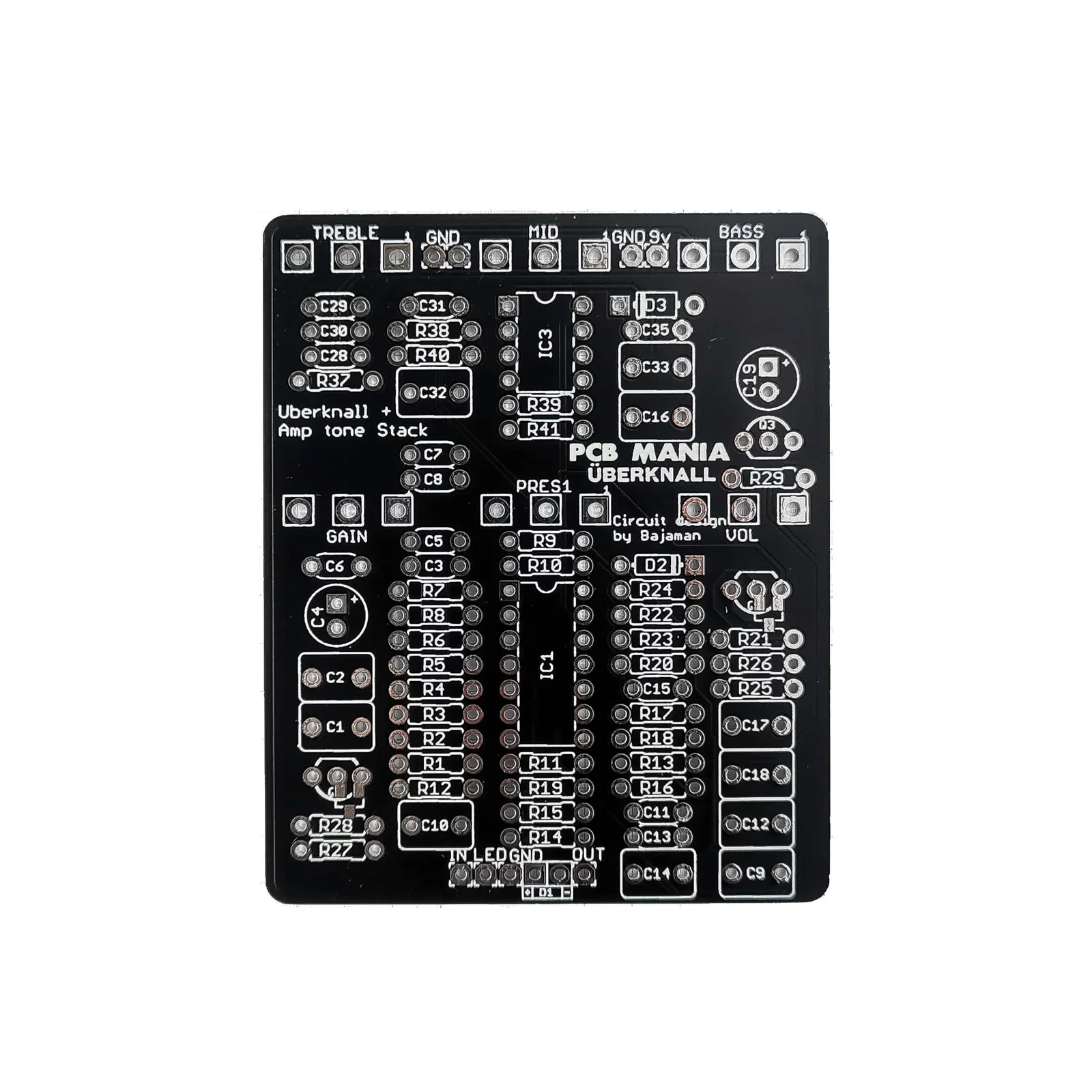 By popular demand, the PCB Mania team decided to make an improved rendition that adds an Amp Tone Stack section that features Treble, Bass, Midrange, and Presence in addition to the Volume and Gain knobs present in our original Uberknall Preamp. When making your build, you can also choose between the standard version and the High-Gain Mode, an option for those who have nothing to lose and everything to GAIN!